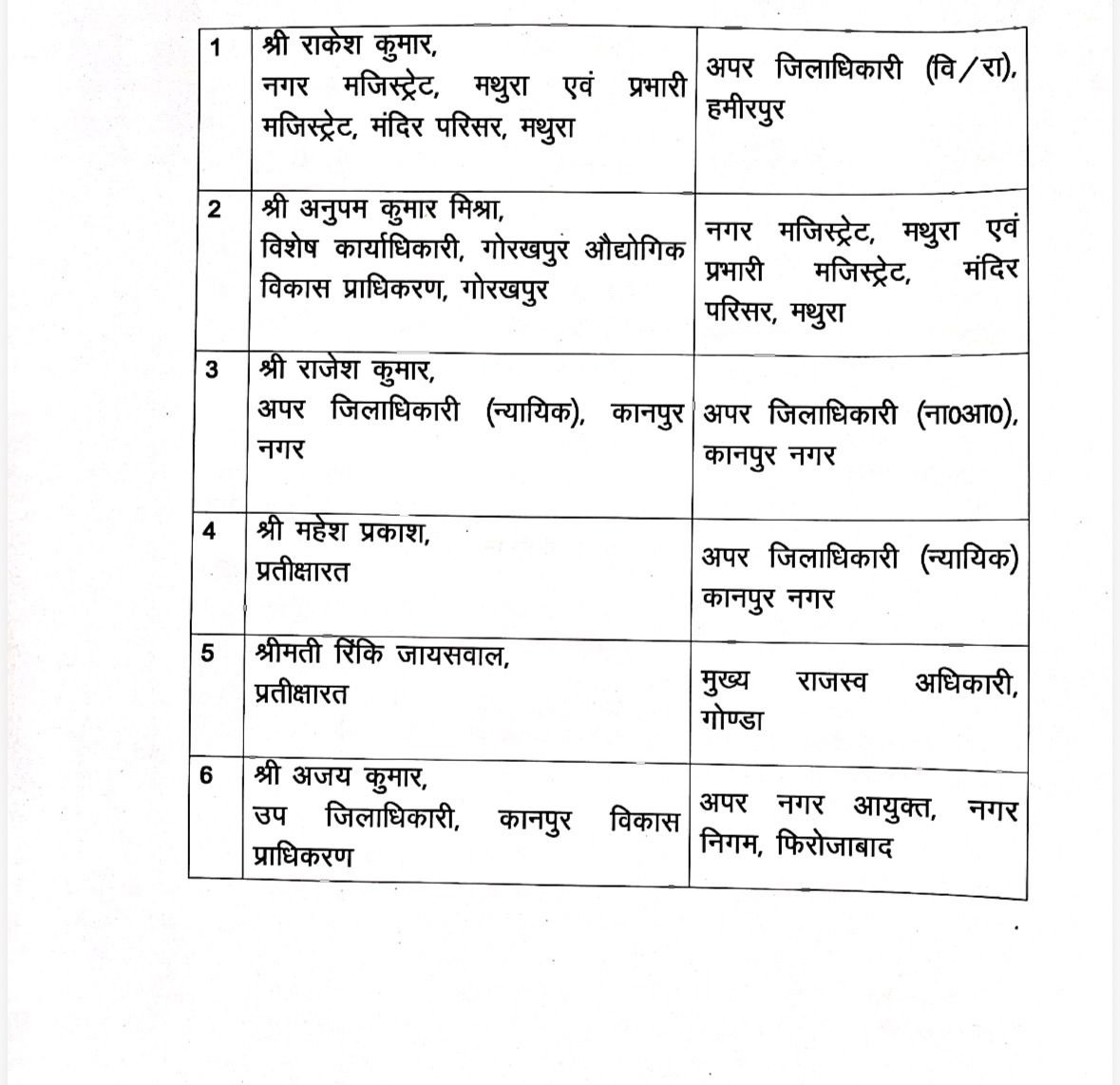 लखनऊ: उत्तर प्रदेश सरकार ने राज्य में प्रशासनिक व्यवस्था को और मजबूत करने के उद्देश्य से 6 सीनियर पीसीएस अधिकारियों के तबादले किए हैं. यह फेरबदल मुख्य रूप से मथुरा, हमीरपुर, कानपुर नगर, गोंडा और फिरोजाबाद जैसे जिलों को प्रभावित करता है. हाल ही में यूजीसी मामले में पीसीएस अलंकार अग्निहोत्री के निलंबन के बाद ये पहले तबादले हैं.